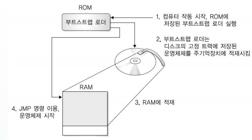 전원을 켜면 -> CPU에서 ROM(전원이 나가도 안 지워지는 메모리, 부트스트랩 로더 존재) 주소 생성 -> 주소 값으로 컨트롤이 넘어감 -> 부트스트랩 로더는 하트웨어 체크, 정상이면 부팅 시작 -> 디스크에 운영체제가 저장되어 있음 -> 부트스트랩 로더가 운영체제를 읽어서 RAM(전원 끄면 메모리 지워짐)에 로딩 -> 로딩 시작 주소에 컨트롤을 넘김 -> 부팅