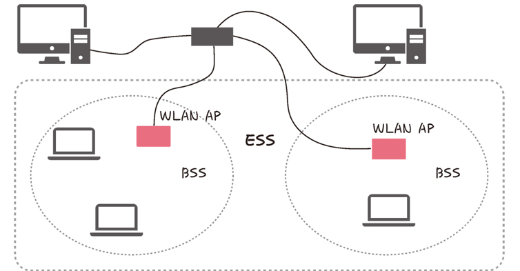 ESS는 하나 이상 연결된 BBS 그룹이다. 장거리 무선 통신을 제공하고 BBS보다 가용성과 이동성이 좋다. 즉 다른 장소로 가도 네트워크를 사용할 수 있다.