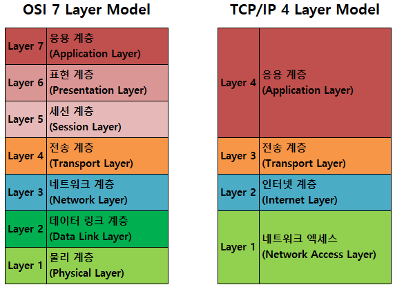 위에서 설명했듯이 TCP/IP 4계층 모델과 OSI 7계층 모델이 있다.