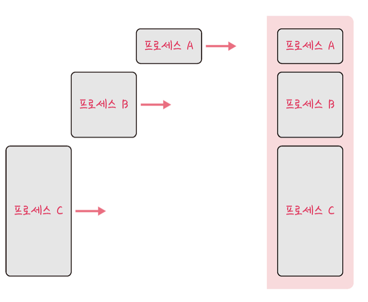 - 외부 단편화(external fragmentation): 메모리를 나눈 크기보다 프로그램이 커서 들어가지 못하는 현상, C를 할당할 여유는 있지만 공간이 연속적이지 않아서 할당을 하지 못한다. Empty 공간을 압축하여 하나로 만들면 C를 할당할 수 있다.