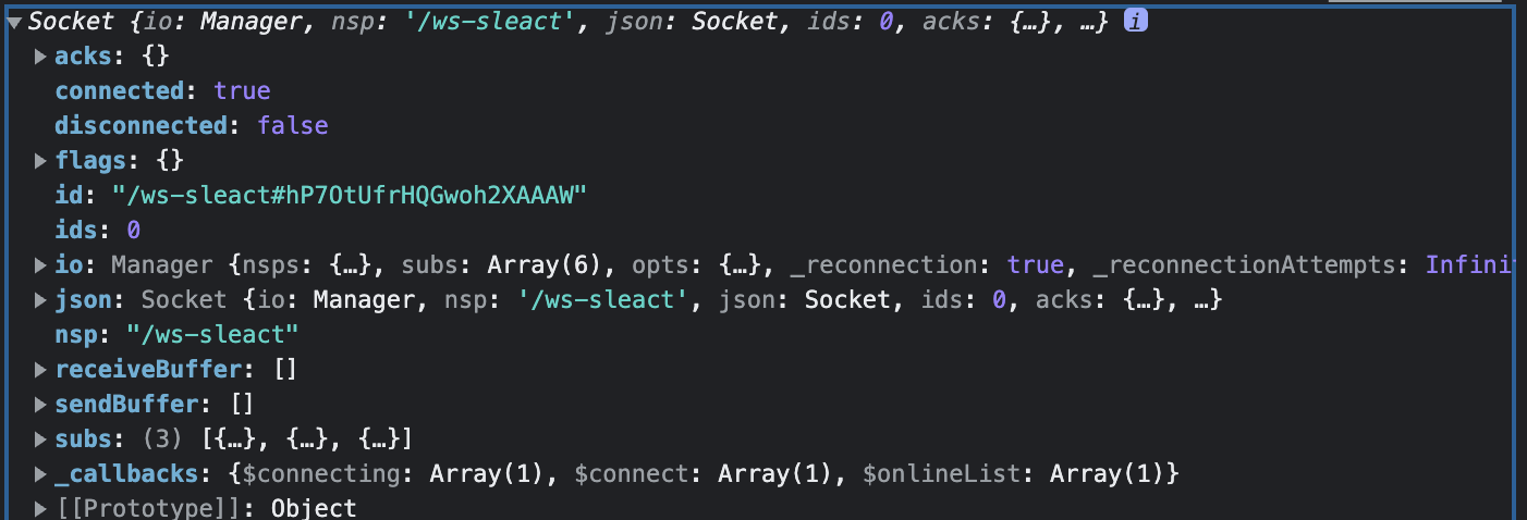 receiveBuffer, sendBuffer: 이 두 배열은 거의 항상 비어 있어야하는데, 만약 차 있으면 데이터를 서버로 보내야 하는데 연결이 끊겨서 못 보내고 있다는 의미이다. 따라서 socket.io는 연결이 다시 되면 sendBuffer에 쭉 모아놨다가 데이터를 보내준다. 반대로 서버쪽에서도 프론트로 보내줘야 하는 데이터를 receiverBuffer에 모아놨다가 연결되면 보내준다.