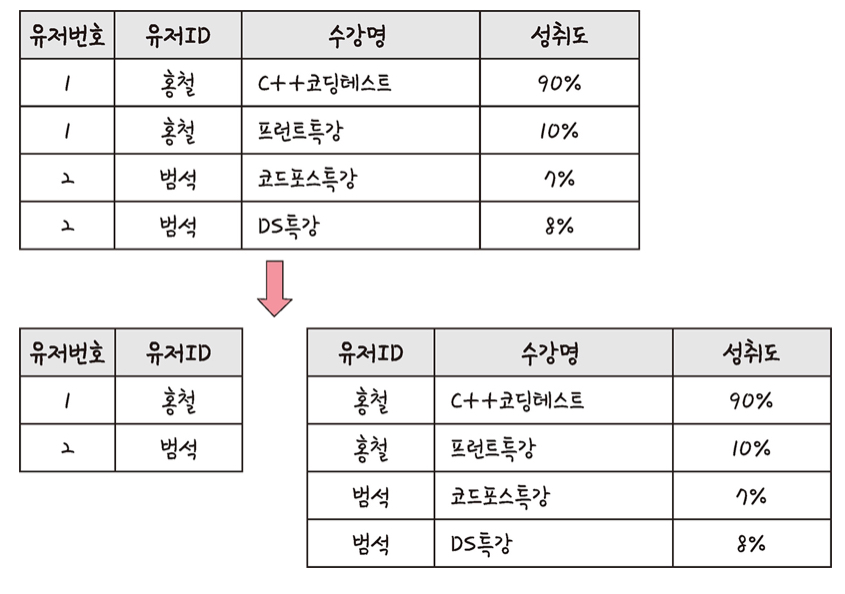 여기서 기본키는 {ID, 수강명}이다. 완전 종속된 유저번호와 기본키에 따른 성취도로 2개의 릴레이션으로 분리되었다.