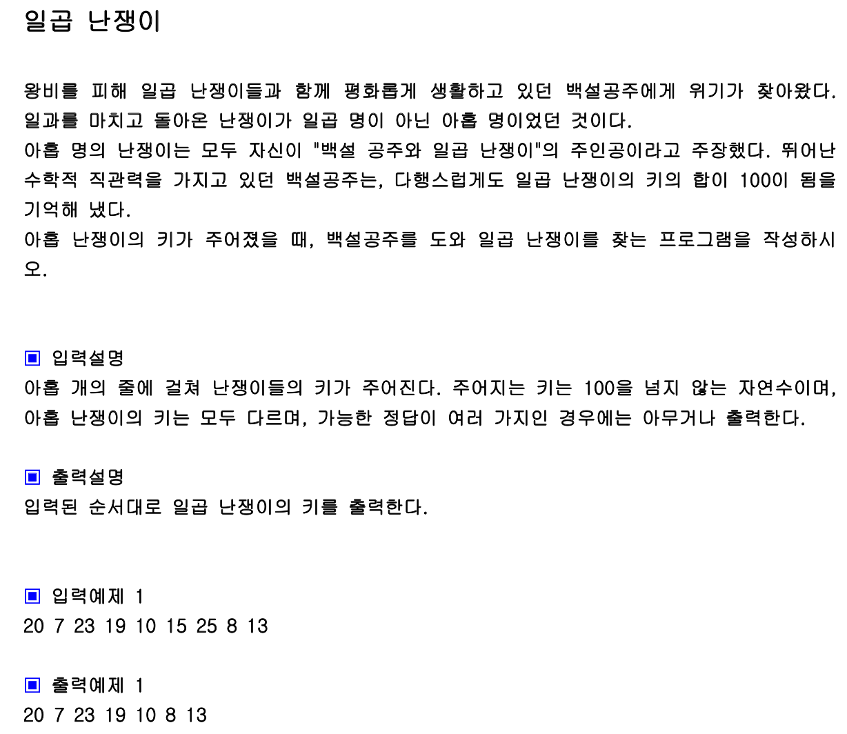 이 문제에서 난쟁이가 아닌 2명을 찾기 위해서는 일일히 다 찾아봐야 한다. 따라서 처음 배열의 모든 합을 구하고 다른 난쟁이를 찾기 위해서 이중 for문을 사용한다. 그리고 2개씩 고르면서 미리 구해놨던 합에서 for문에서 찾은 2개의 값을 빼서 100이되면 정답이다.