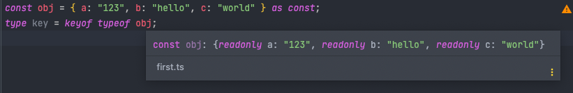 keyof를 붙이면 키들 뽑아내고 싶을 때 사용하면 된다. 즉 a, b, c를 타입으로 사용할 수 있다.