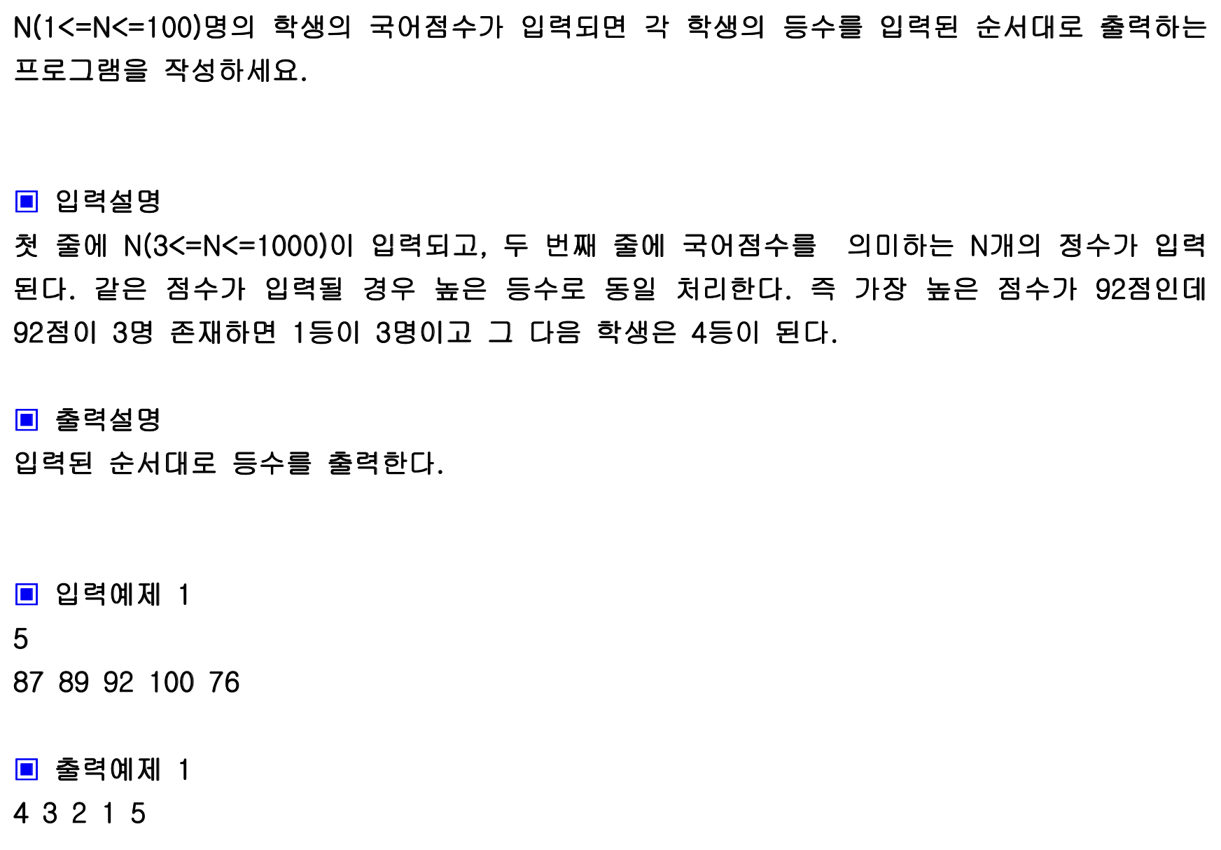 이 문제는 우선 입력된 점수 길이 만큼의 1로 이루어진 배열을 만들어야한다. 그리고 이중 for문을 두고 첫번째 for문 i를 기준으로 비교하면서 두번째 for문 j를 비교한다. i번째 있는 점수가 j번째 있는 점수보다 작으면 등수를 올려야해서 처음 만들 배열에 i 번째 위치를 +1을 해준다.
