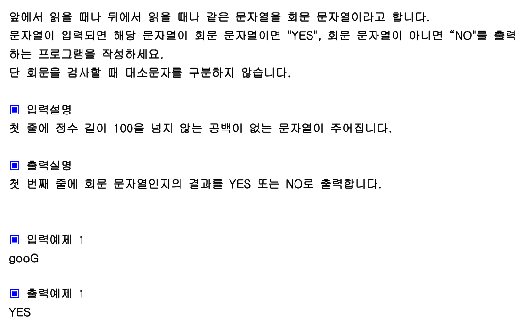 우선 대소문자 구별을 하지 않으니까 대문자나 소문자로 통일해야 한다. 그리고 for문으로 문자 길이의 절반만 돌면서 자기와 대칭되는 문자가 같은지 다른지 보면된다.
