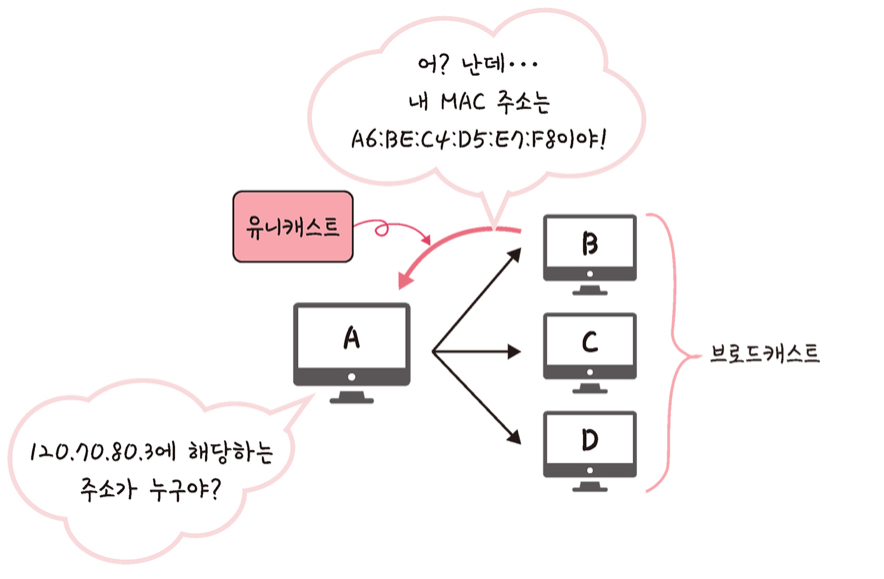 ARP Request 브로드캐스트를 보냄 -> 원하는 IP 주소를 가진 장치를 찾음 -> 찾아진 장치에서 APR reply 유니캐스트를 이용해 MAC 주소를 반환 -> 원하는 MAC 주소 얻음