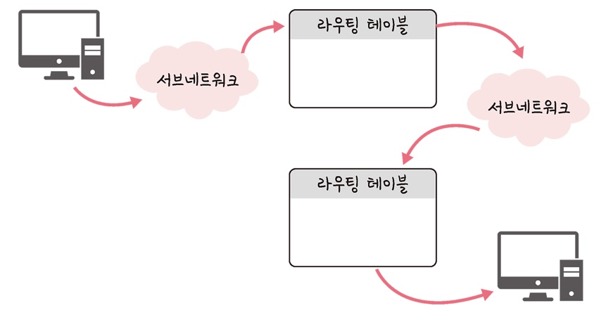 각 라우터에 있는 라우팅 테이블의 IP를 기반으로 패킷을 전달한다. 즉 라우팅 테이블의 IP를 통해 시작 주소부터 다음 IP로 이동하는 라우팅 과정을 거쳐 패킷이 최종 목적지에 도착한다.