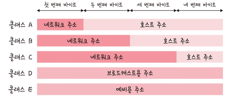 클래스 기반 할당 방식은 A, B, C, D, E의 5개 클래스로 구분해 IP 주소 체계를 관리한다. 네트워크 주소 + 호스트 주소로 사용한다.