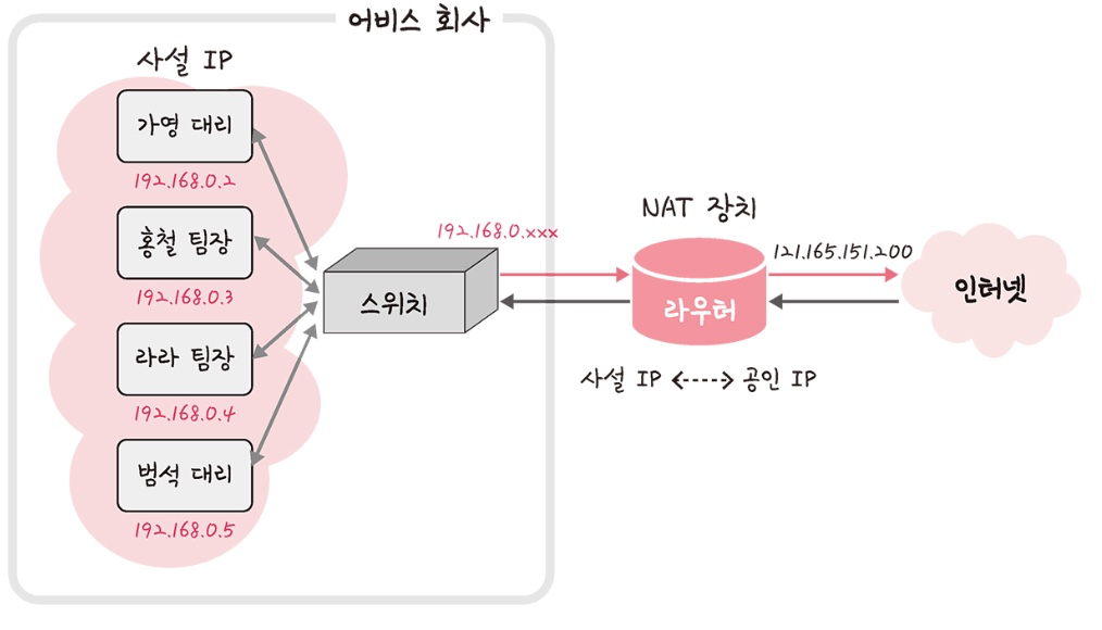 => 공인 IP를 기반으로 직원마다 다른 IP를 가지는 것 처럼 사용 가능하다. NAT 장치를 통해 "공인IP <-> 사설 IP" 서로 변환이 가능하다.