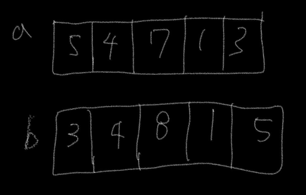이런 a와 b 배열이 있으면 pa = pb = 0으로 먼저 초기값을 둔다. while문을 두 배열 중 하나라도 끝에 도달하면 끝낸다. 이때 a[pa]와 b[pb]가 같으면 answer 배열에 추가 해주면된다. 하지만 다르면 두 값 중에 작은 값을 가진 pa/pb를 1 증가시킨다.