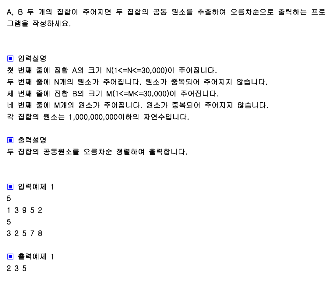 이런 a와 b 배열이 있으면 pa = pb = 0으로 먼저 초기값을 둔다. while문을 두 배열 중 하나라도 끝에 도달하면 끝낸다. 이때 a[pa]와 b[pb]가 같으면 answer 배열에 추가 해주면된다. 하지만 다르면 두 값 중에 작은 값을 가진 pa/pb를 1 증가시킨다.