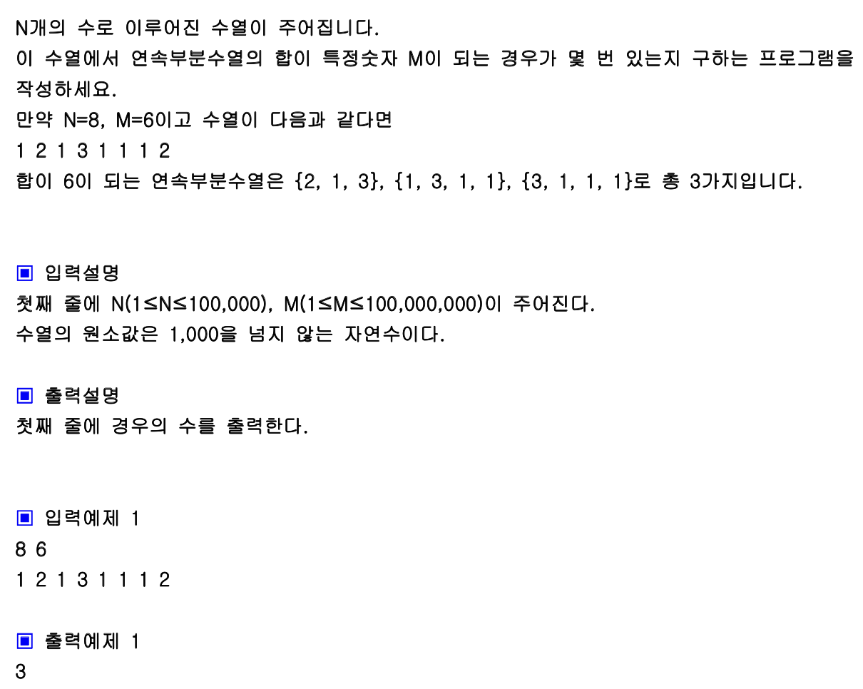 이 문제도 투포인터를 사용하면 쉽게 해결된다. lt을 왼쪽, rt를 오른쪽으로 두고 rt를 하나씩 증가 시켜보면서 sum과 같으면 answer을 증가시키면 된다. 만약 rt를 더하다가 m보다 더 커지면 lt에 있는 값을 빼고 lt 인덱스를 1 증가 시킨다. 이때 sum이 m과 같은지 확인하면 된다.