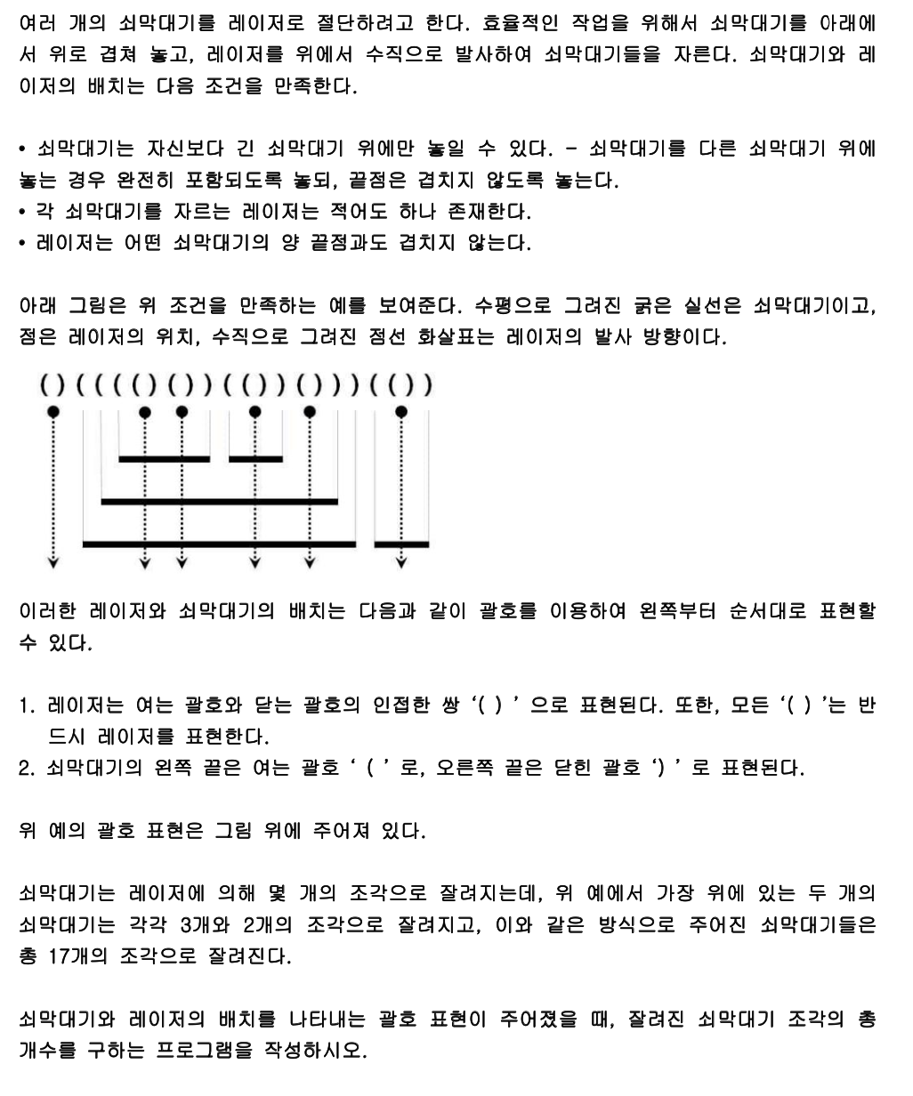 이 문제는 스택으로 해결할 수 있다. 만약 괄호가 "("이면 스택에 넣는다. 그러다가 ")"를 만나면 2가지 케이스로 나뉜다. 우선 무조건 스택에 있는 "(" 1개를 삭제한다. 그리고 앞이 "("이면 레이저라서 스택에 있는 "(" 개수만큼 answer에 더해준다. 앞이 ")"이면 막대가 끝난거라서 잘리고 남아있는 막대 1개를 answer에 더해준다.