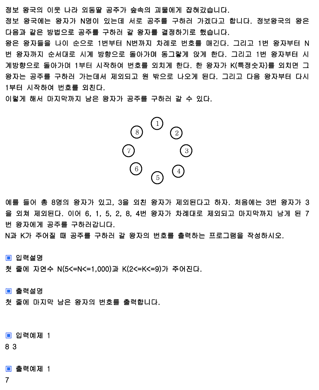 이 문제는 일단 왕자의 수 만큼 배열에 넣어둔다. 그리고 우선 k-1만큼 앞 왕자를 빼서 뒤로 보낸다. 그리고 k번째 왕자가 있는 숫자를 제거한다. 이것을 1명의 왕자가 남을 때 까지 반복하면 된다.