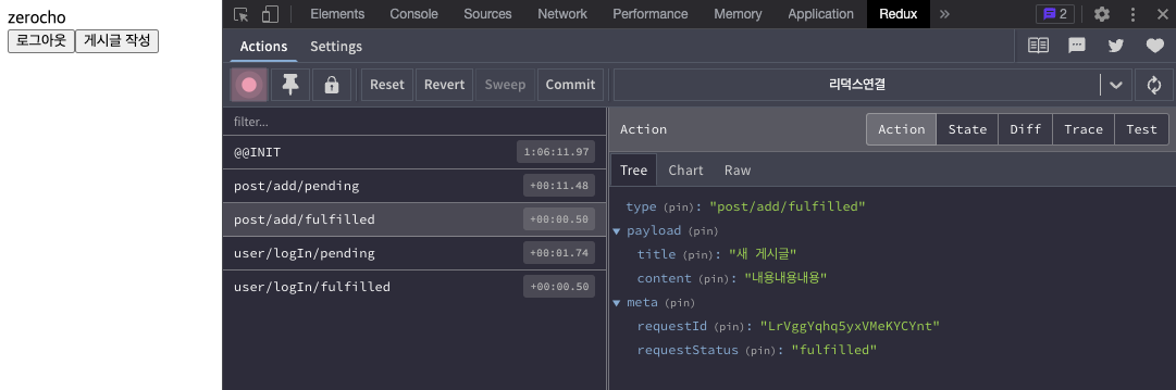 devtools의 Action Tree를 보면 payload, meta가 있다. 실패한 경우에는 Action Tree에 erroer도 있다.