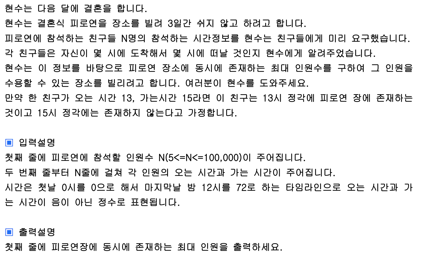 내가 생각한 풀이는 리스트를 들어온 시간 순서대로 정렬하고 처음 들어온 사람의 퇴장 시간을 max에 저장한다. 그리고 다음 사람의 들어온 시간과 비교해서 count를 올려주는 방식으로 풀었다.
