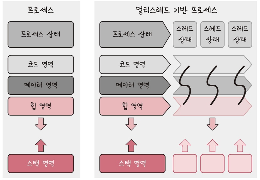 스레드는 코드, 데이터, 힙 영역을 서로 공유하고 그 외 영역은 따로 관리된다.