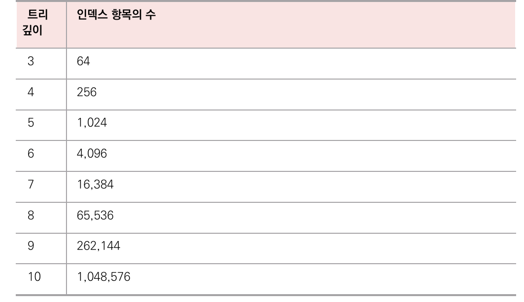 트리의 깊이가 1개씩 증가하면 최대 인덱스 항목의 수는 4배씩 증가한다.
