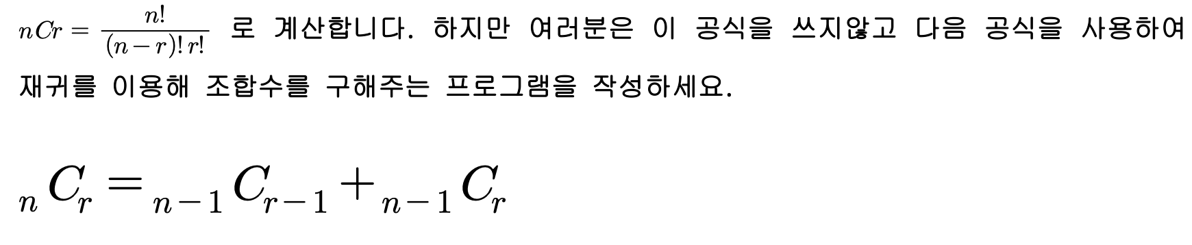 조합은 n === r 이거나 r이 1이면 값이 1이라 1을 반환해주면 된다.