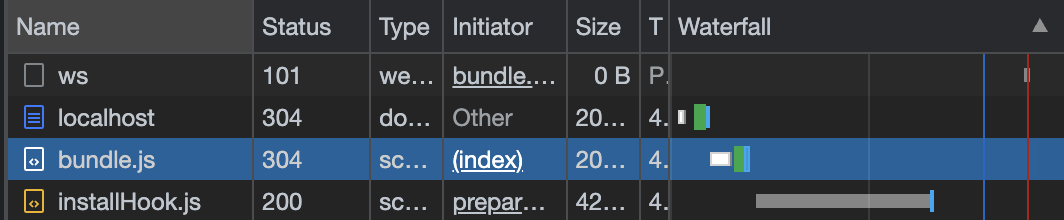 개발자 도구의 network 탭에 가면 메모리에 저장되어 있는 bundle.js가 보인다. 파일 입출력보다 메모리 입출력이 더 빠르고 자원이 덜 사용되어 효율적이다.
