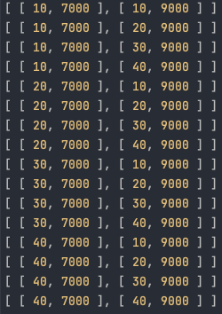 DFS 함수를 이용해서 이모티콘 할인율에 대한 모든 경우의 수를 구하고 allCase에 저장한다. allCase에는 위 사진처럼 저장된다.