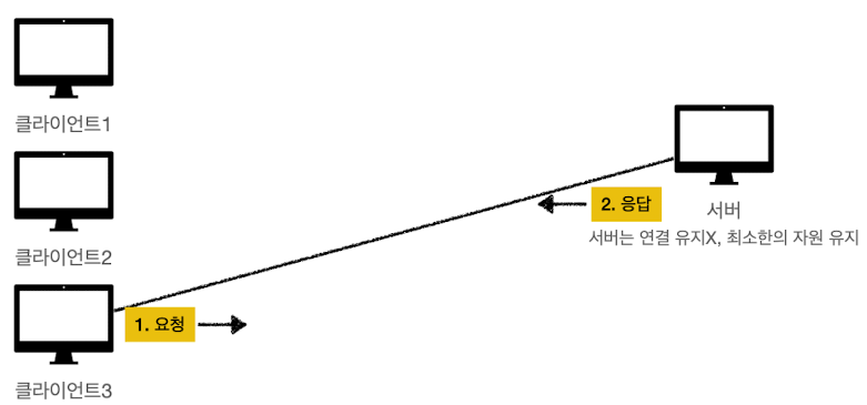 사진처럼 요청과 응답이 이루어지면 TCP 연결을 종료하는 방식이다. 연결을 유지하지 않으면 최소한의 자원으로 서버를 유지할 수 있다. 많은 사용자가 서비스를 이용해도 실제 서버에서 동시 처리하는 요청은 수십 개 이하로 작다.