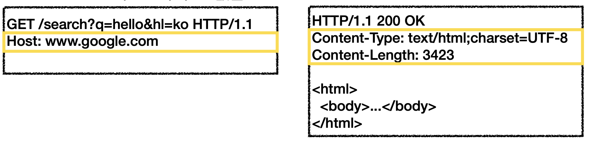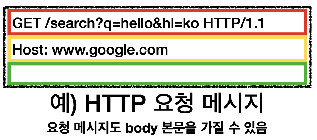 request-line: HTTP 메서드(GET, POST 등), 요청 대상(/search?q=hello&hl=ko), HTTP Version 이렇게 3가지가 온다.