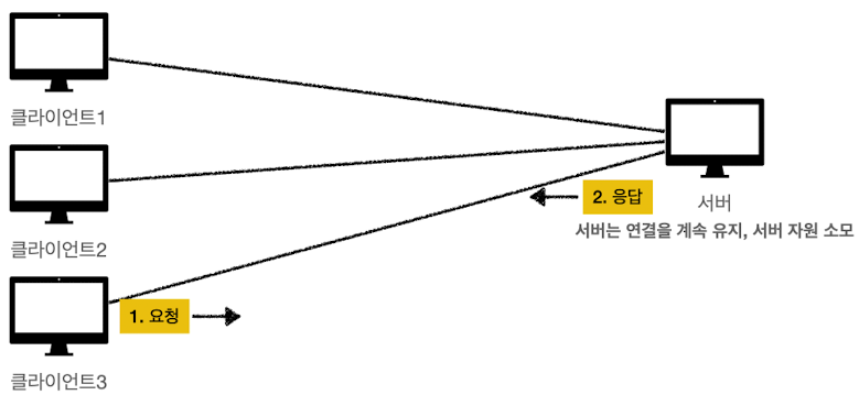 사진처럼 클라이언트와 서버가 계속 연결을 유지하면 클라이언트가 서버를 이용하지 않을 때도 이용하지 않아 자원이 낭비된다. 따라서 많은 사용자가 서비스를 이용할 수 없다.