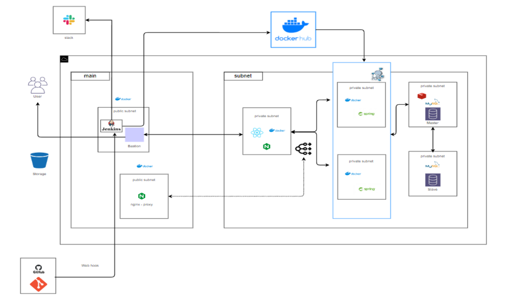 주요 사용 Tool은 Jenkins, Docker, Dockerhub, GitHub, Nginx 등이며, 깃허브에 main 브랜치에 push가 되면 자동으로 배포가 되게 설계하였다.