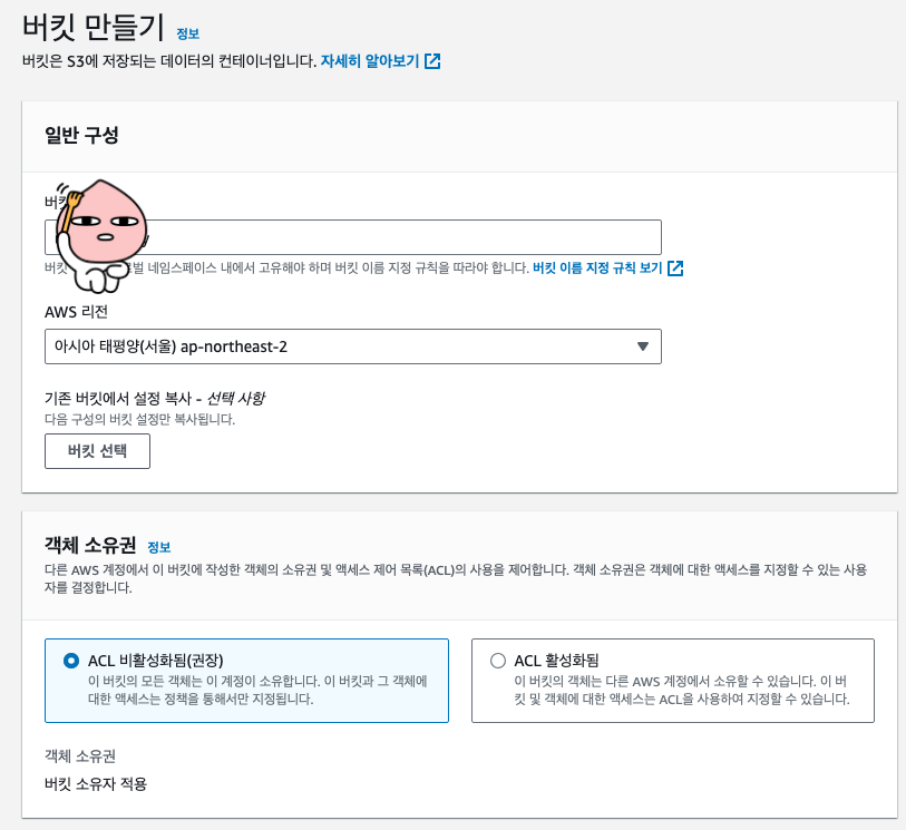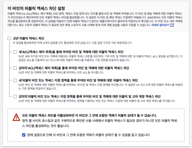 퍼블릭 엑세스 권한을 해제했다. 나머지는 건들지 않고 생성했다.
