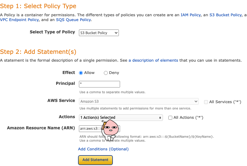 - Actions: GetObject (조회만 가능하도록 getObject 권한만 체크)