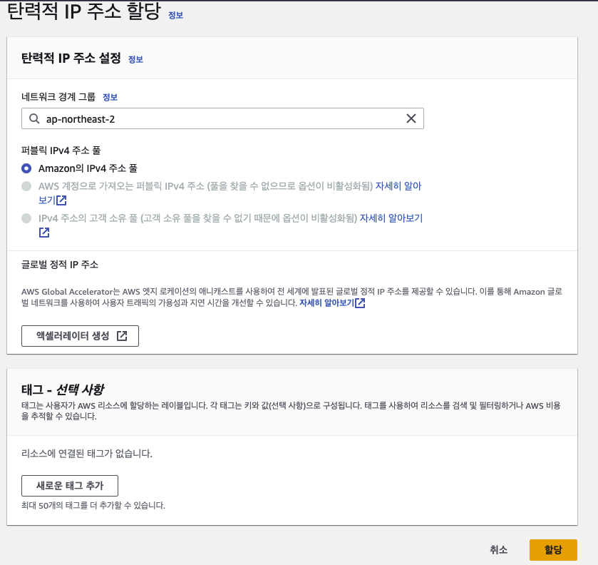 그렇기에 탄력적 IP를 발급받아야 한다. 주의할 점으로는 탄력적 IP는 인스턴스와 연결되어야지만 무료이다!