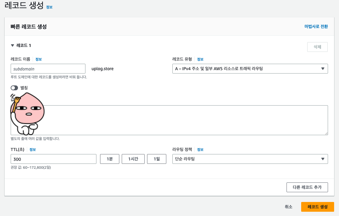 레코드 이름에는 빈 값으로 하면 uplog.store에 배정이 된다. 그리고 레코드 유형은 A 타입으로 하면 된다.