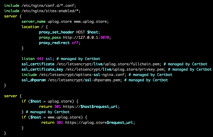 또한 마지막 server 부분에 www.uplog.store로 요청이 오면 www를 제외하도록 수정했다.
