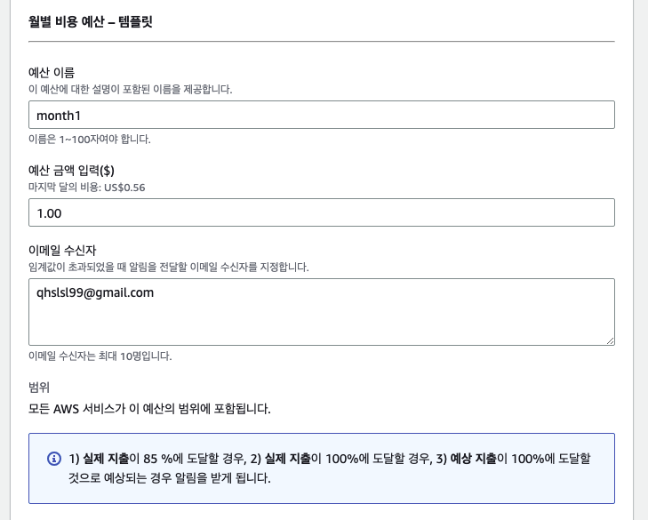AWS Billing -> 예산 -> 예산 생성에 들어갔다.