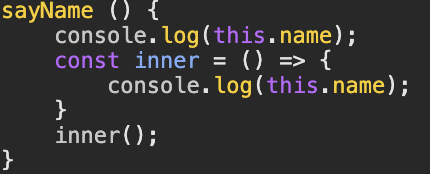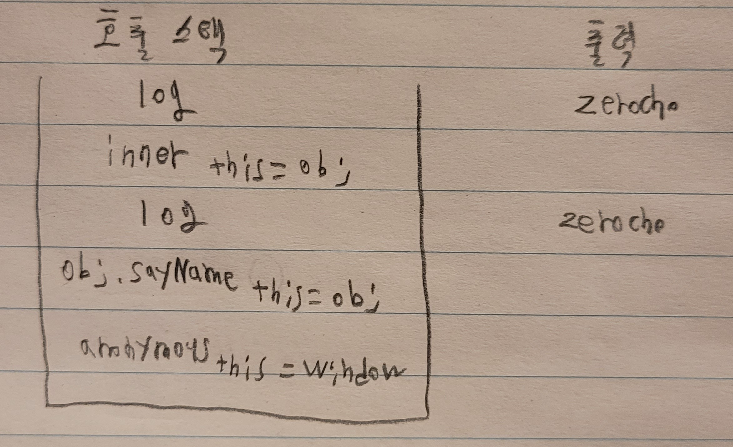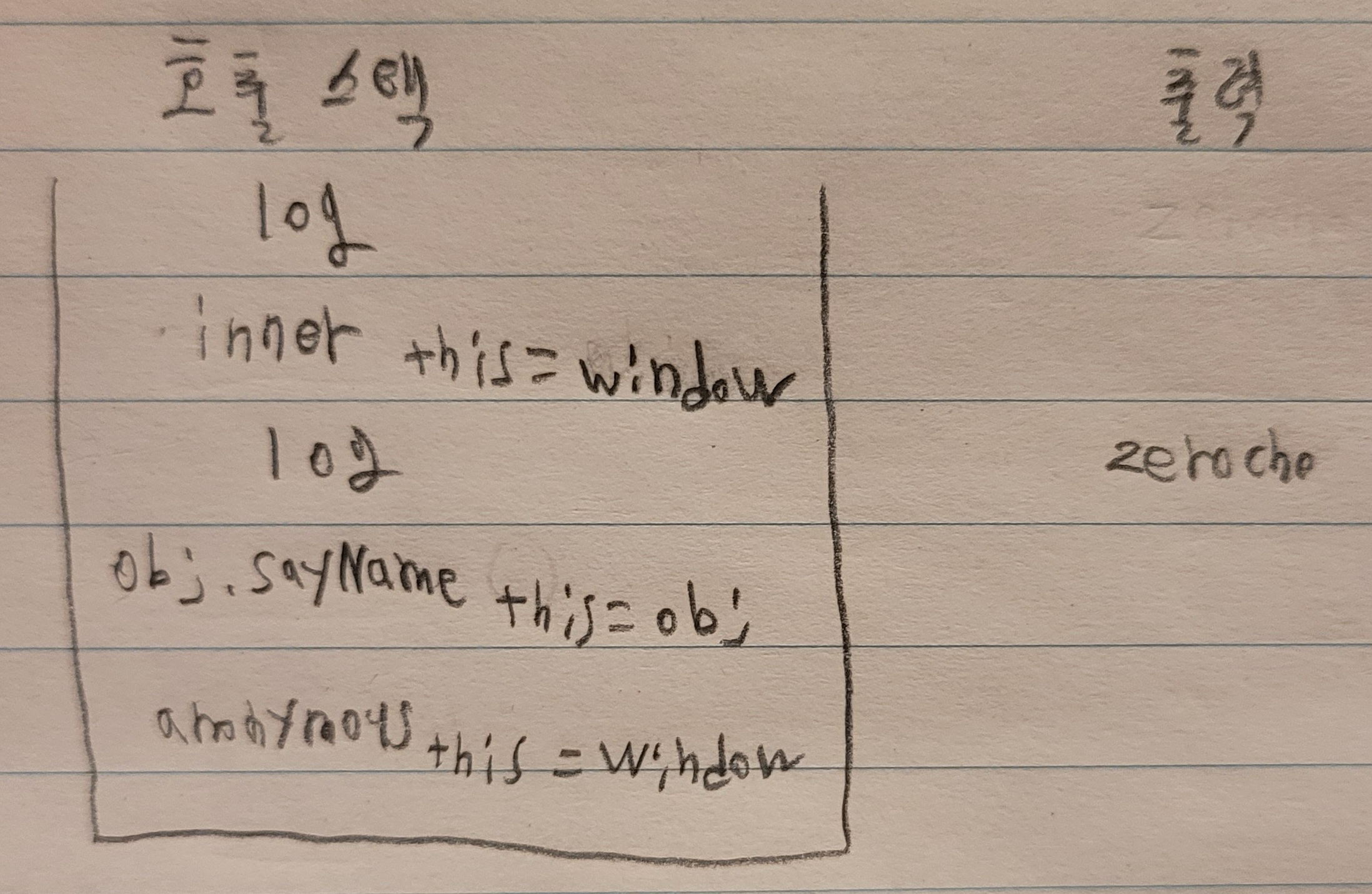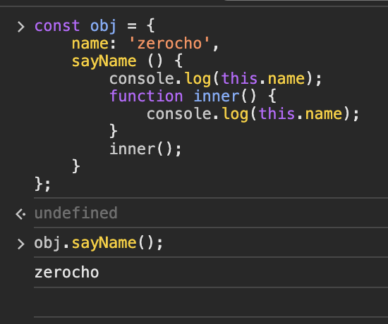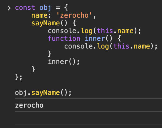 - 여기서 inner()의 console.log의 this는 obj.sayName()이 실행됨으로써 실행되었다.