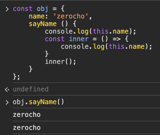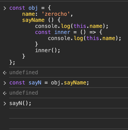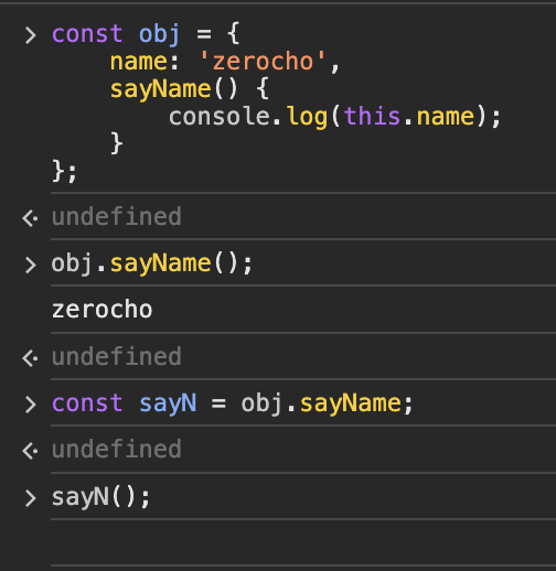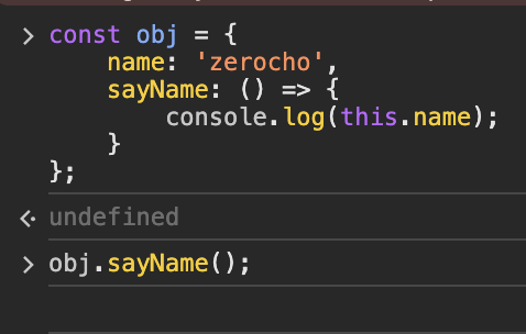 - obj.sayName()에서는 obj가 앞에 붙었고, sayName이 화살표 함수가 아니기 때문에 'zerocho'가 출력