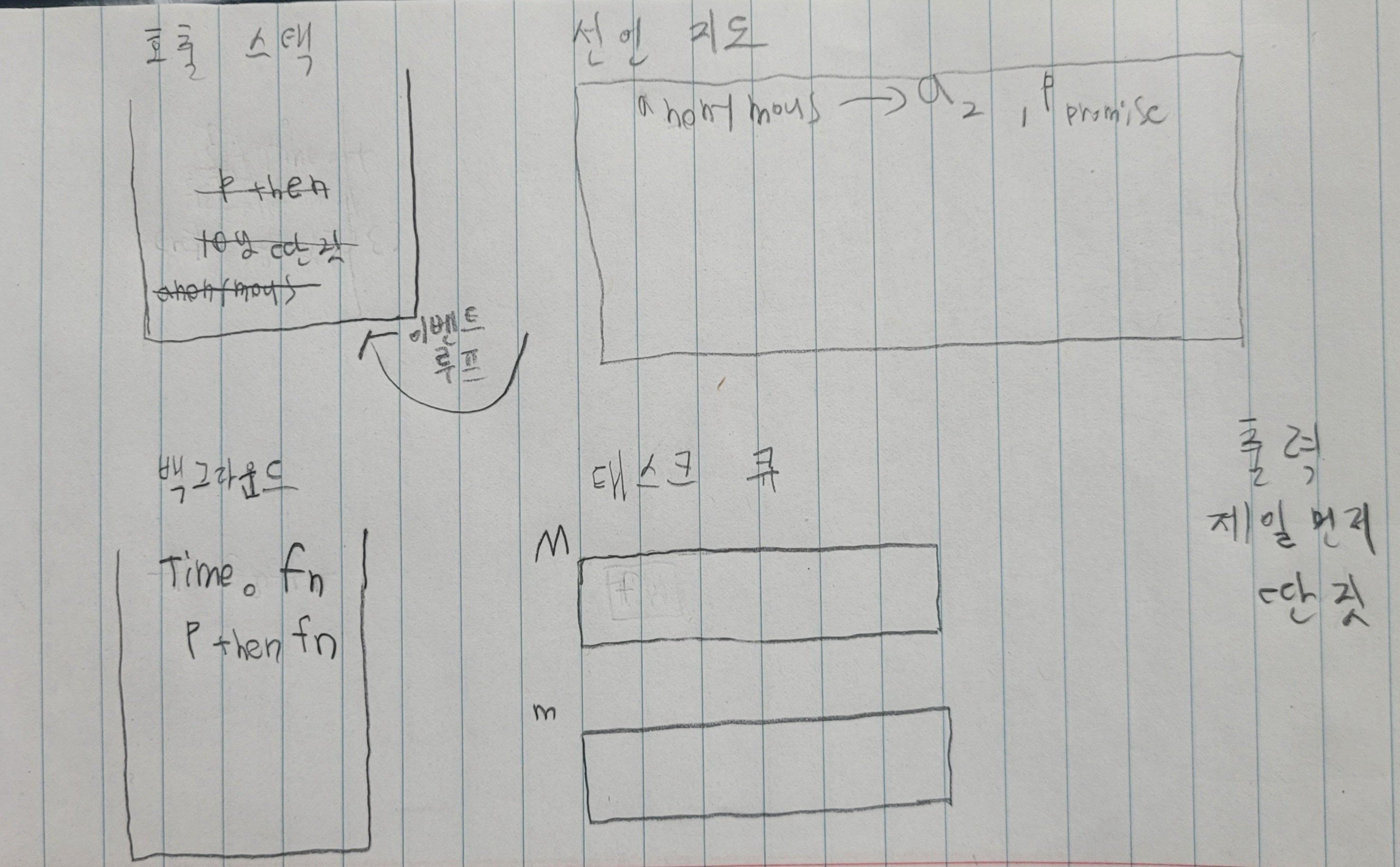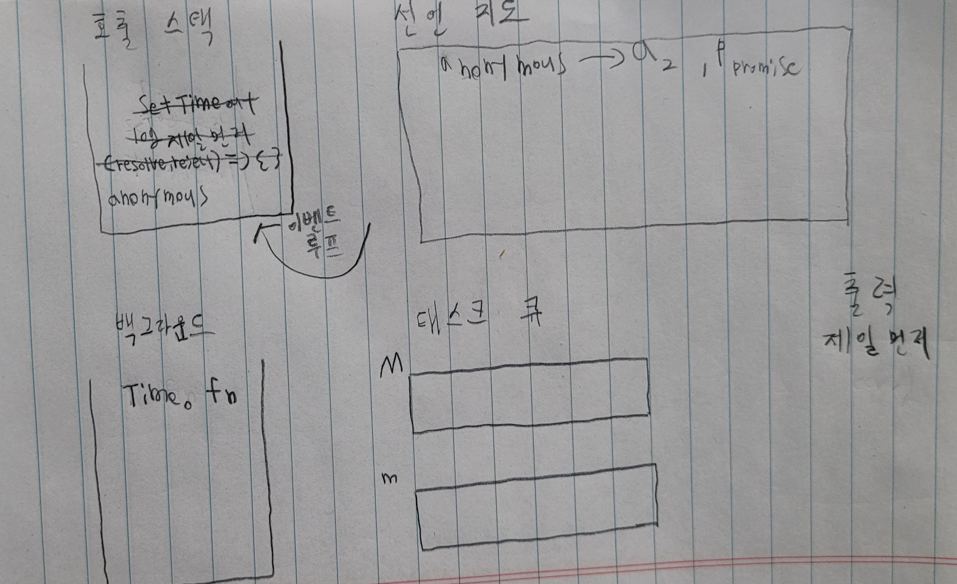 - 백그라운드에 있는 Time(0) fn은 0초가 지나면 태스크 큐의 매크로(M)로 간다.