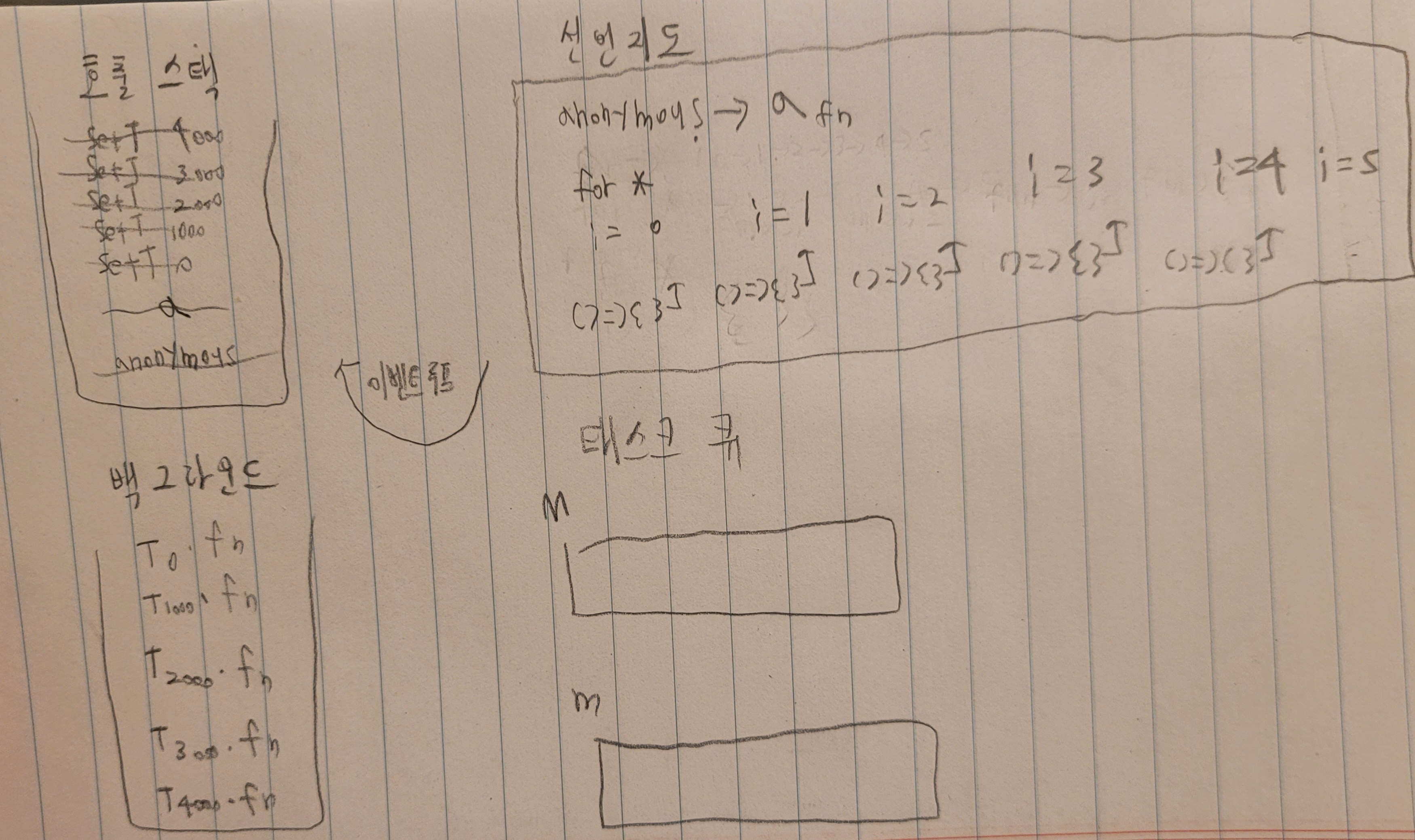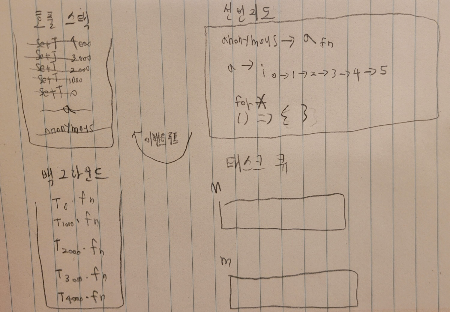 - for 문이 돌면서 setTimeout은 비동기니까 콜백 함수가 백그라운드로 넘어간다.