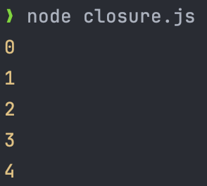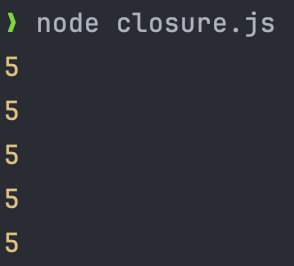 - 이제 비동기 부분이 실행되는데 i가 5가 되어있어서 출력 결과가 모두 5가 나오게 된다.