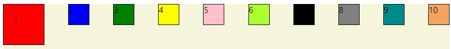 flex-start: 기본값이며 처음부터 왼쪽으로 나열한다. 수직축이 중심축이면 위에서 아래로