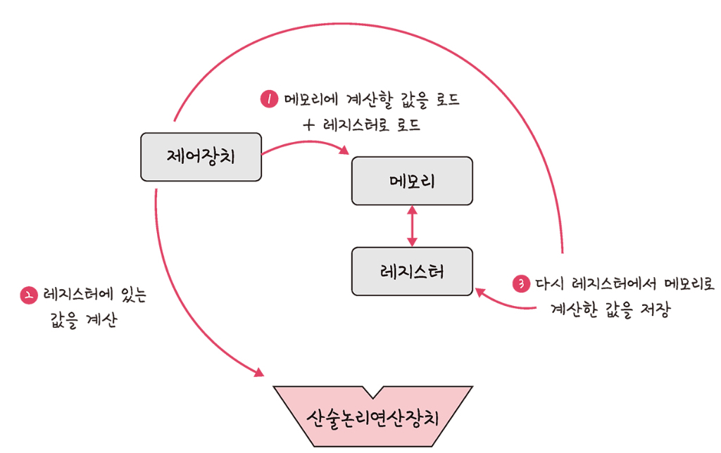 3. 제어장치가 계산된 값을 다시 레지스터에서 메모리로 저장한다.